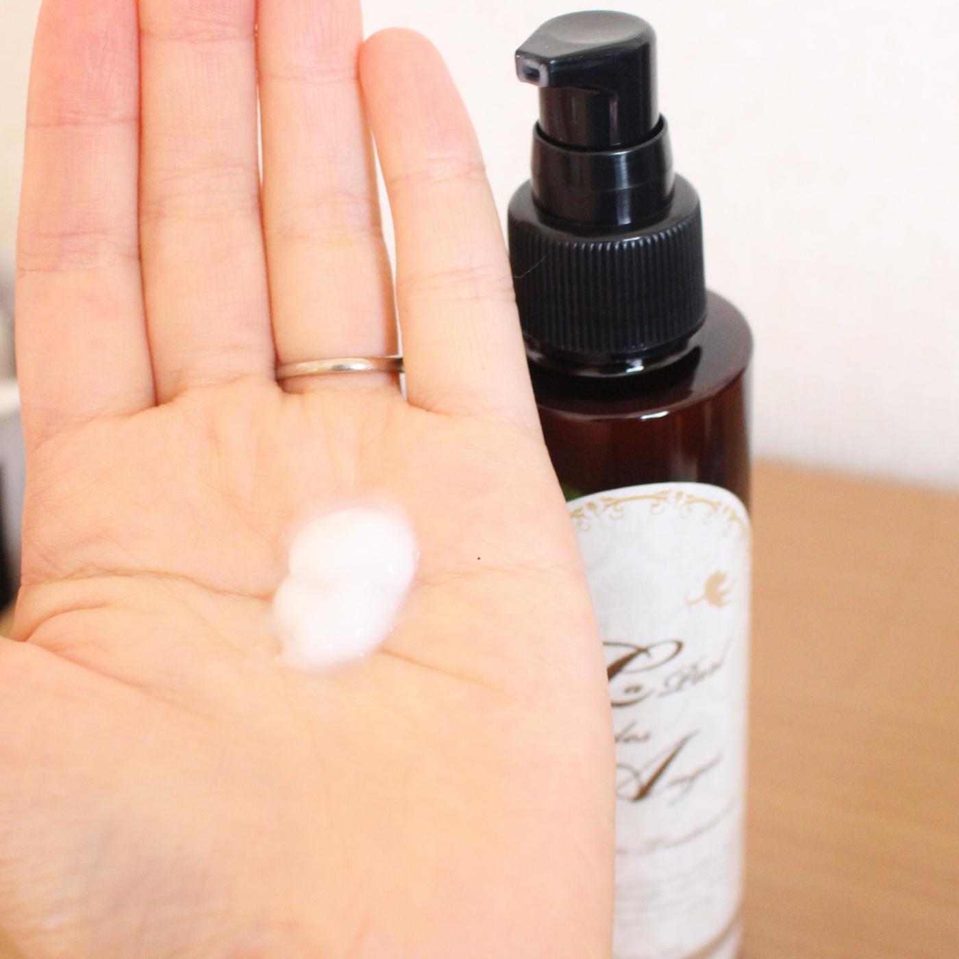 乳白色でしっかりとしたテクスチャーなので、髪の毛にも馴染ませやすいです。