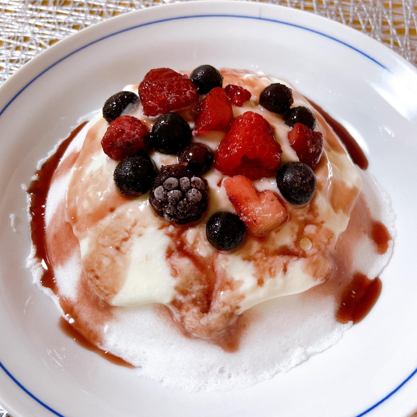 ムースケーキにヨーグルトやベリーミックスを振りかけると、おしゃれスイーツに大変身🍨