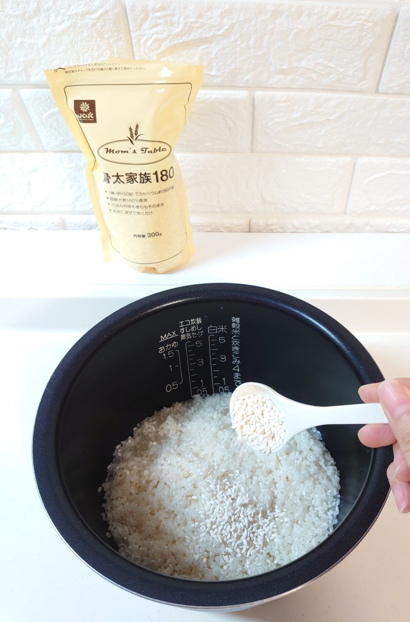 炊き方は白米1合につき1さじ(専用スプーン約10g)と水20mlを加え、軽くかき混ぜて30分ほど吸水してから炊飯します。