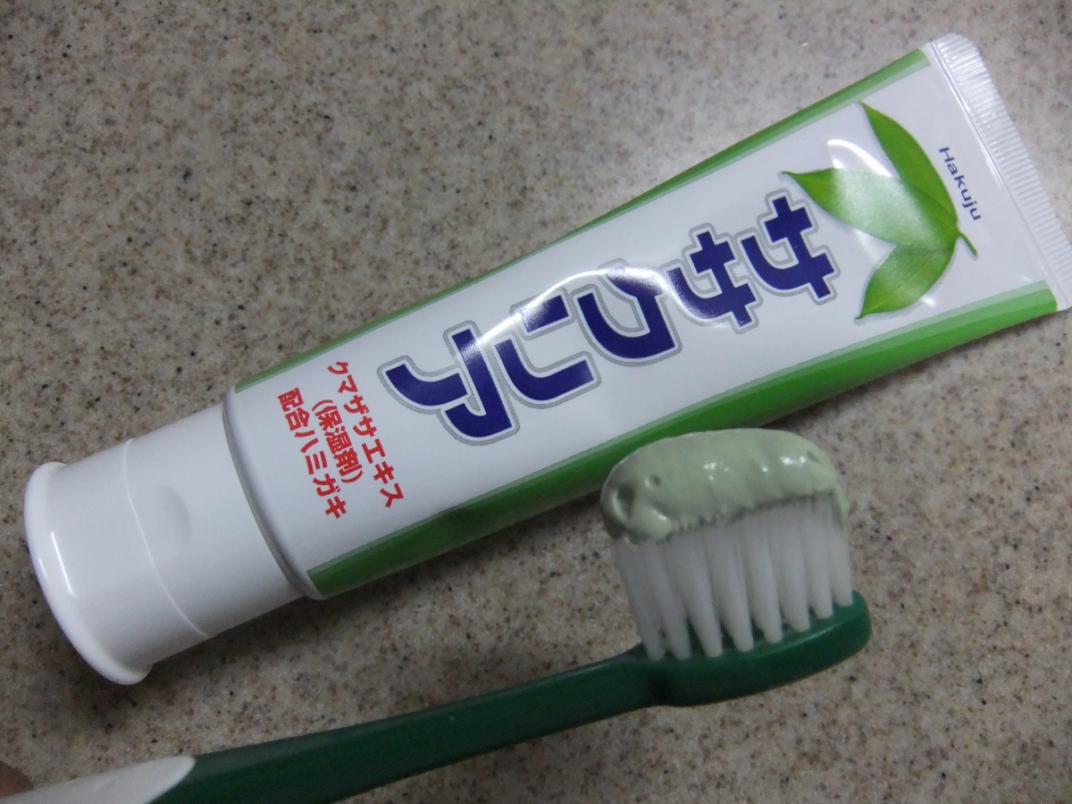 クマザサエキスの他に、カンゾウエキス・オウゴンエキス・カミツレエキス・アロエエキス・ローズマリーエキスと植物エキスを使用しているからかな緑色をした歯磨き粉。