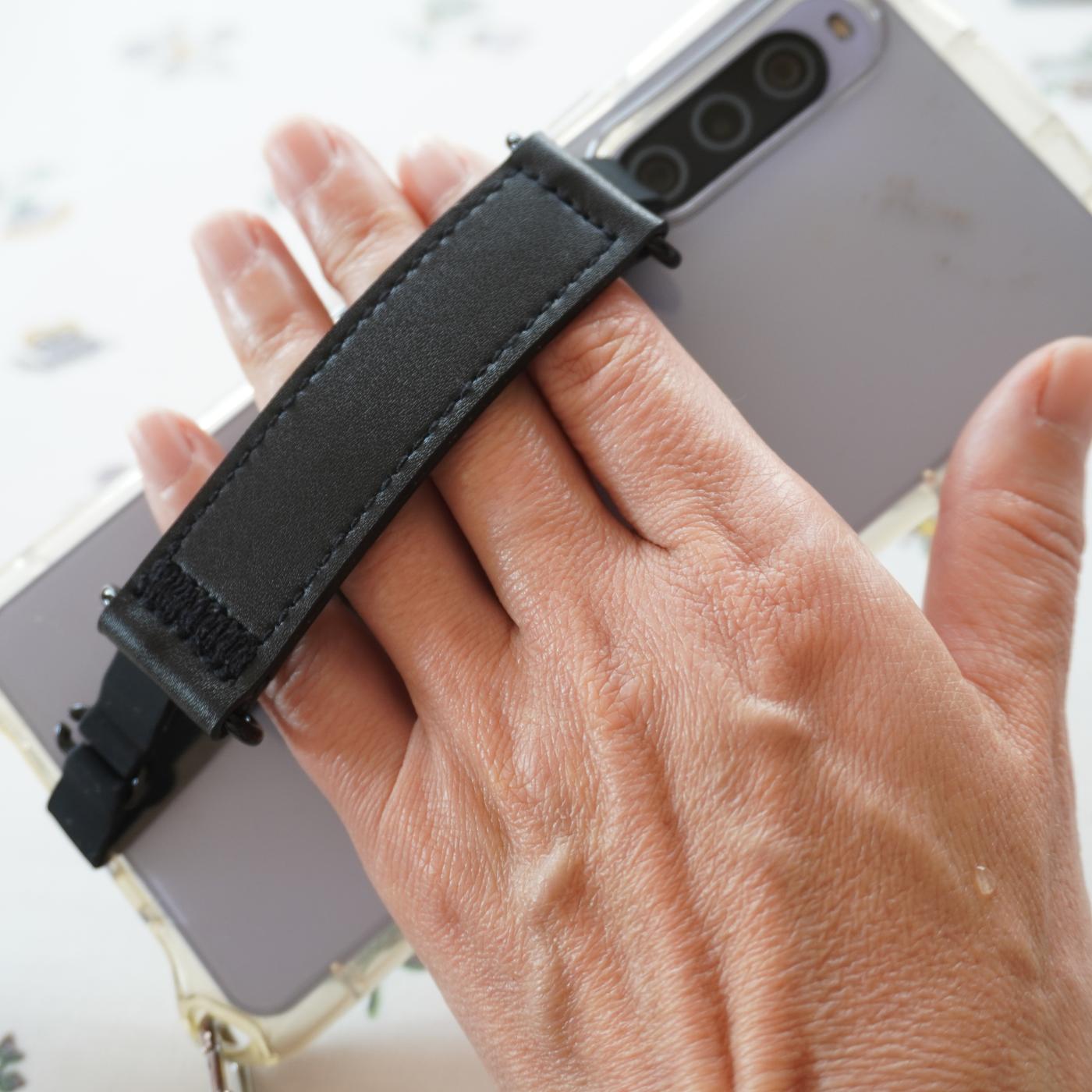 スマホバンドは本革でお色はブラックです。