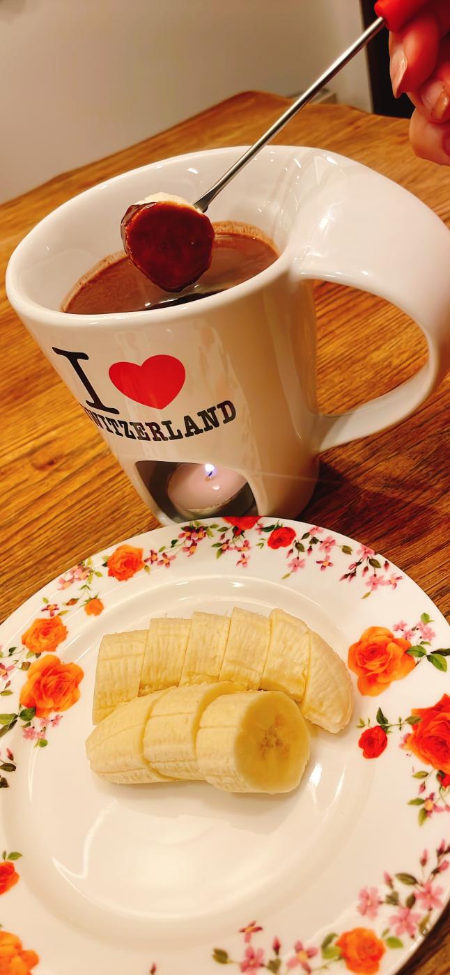 早速板チョコを買ってきて、バナナをつけてみました。チョコレートはこまかう刻み、牛乳と一緒に湯煎したものを入れましたが、ロウソクで温めているからか、ずっとトロトロで最後まで美味しく頂けました。