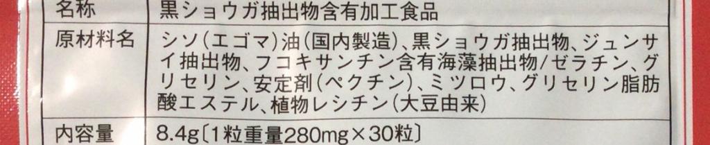 シソ(エゴマ)油、黒ショウガ抽出物、ジュンサイ抽出物、フコキサンチン含有海藻抽出物、ゼラチン、グリセリン、安定剤(ペクチン)、ミツロウ、グリセリン脂肪酸エステル、植物レシチン(大豆由来)