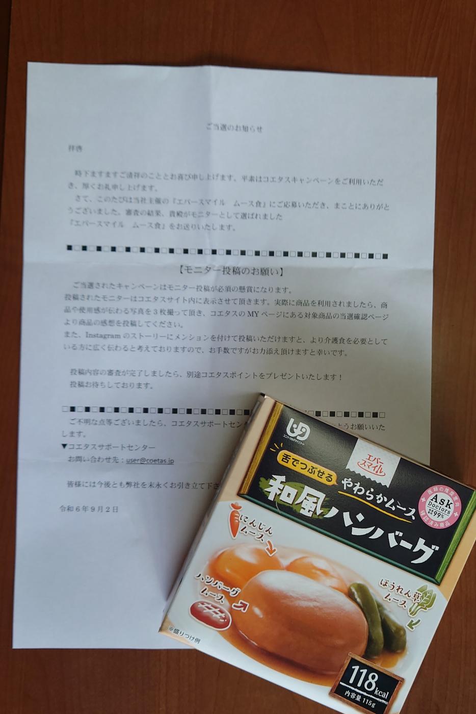 コエタス様より健康ごはんのヘルスディッシュの「やわらかムース 和風ハンバーグ」のモニターを承りました。