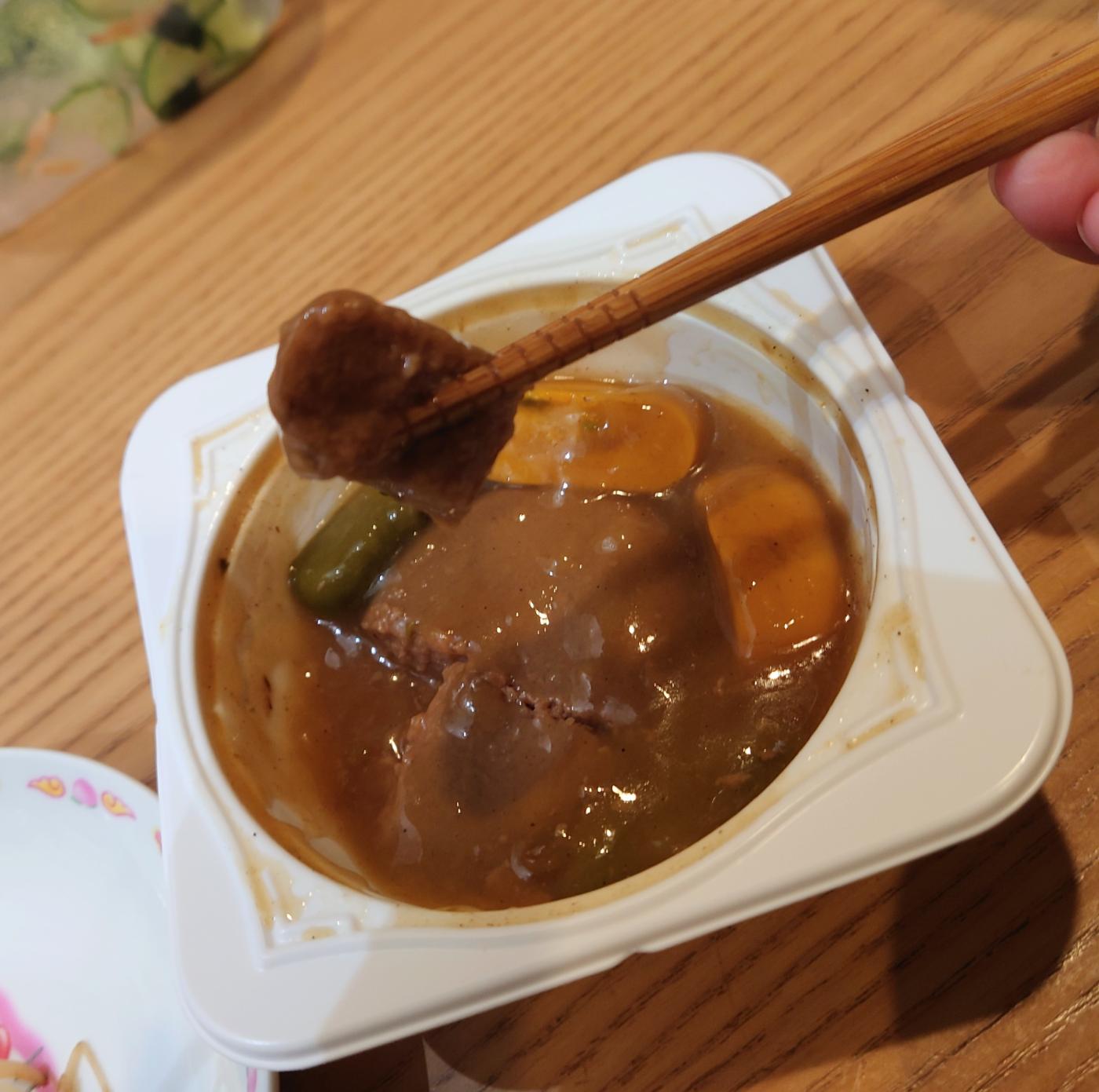 すっと箸が入り、とても柔らかく飲み込みやすいし、煮込みハンバーグのようにしっかり味もついています。