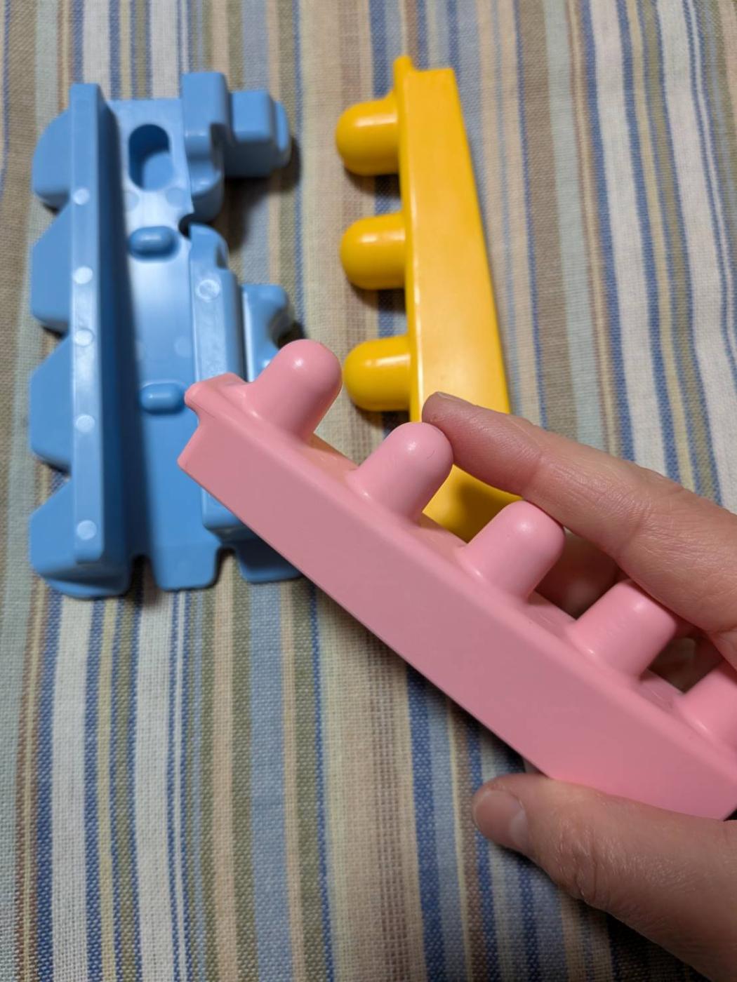 大きなレゴブロックみたい☆パーツごとに色が違うから、組み合わせの説明もわかりやすいです!3つのパーツがあります。