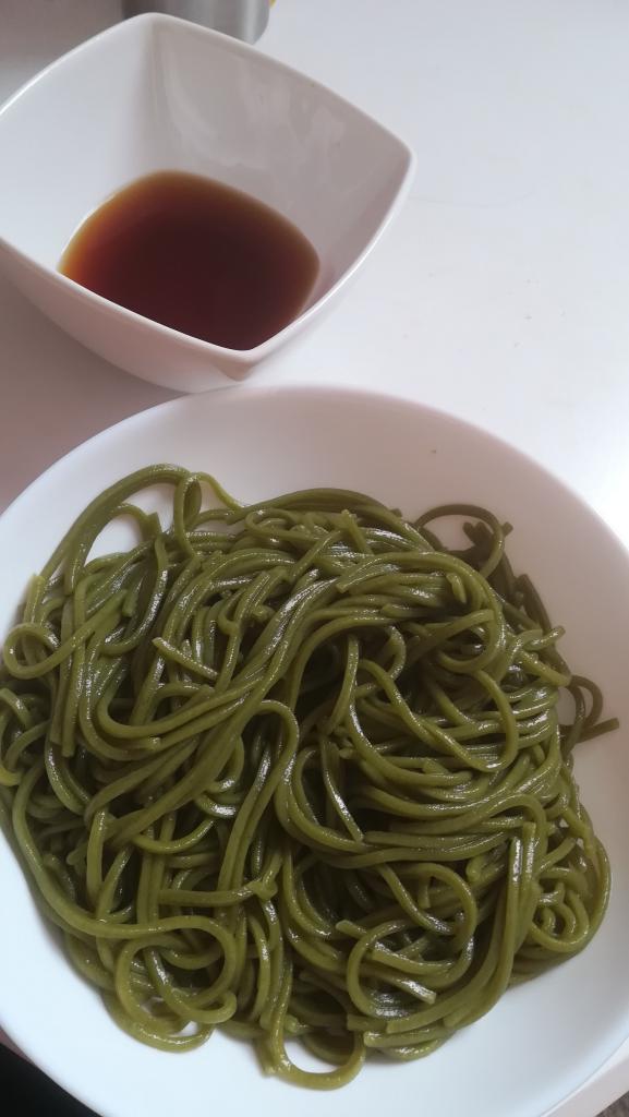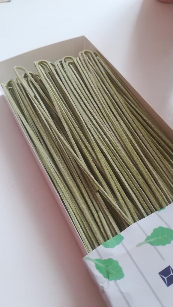 ゆでる前から野菜がたっぷり練り込まれているのがわかる緑色でしたが、ゆで上がりはより濃い緑色になってとっても健康に良さそうな印象でした。