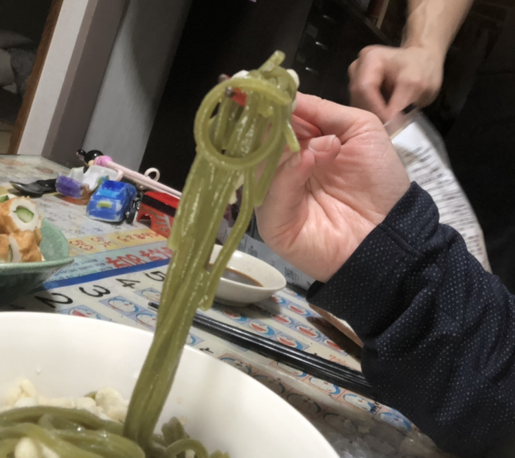 私もダサいとまではいかないけど、どう考えてもそばの食感、見た目だったので、うどんはないかと思います。乾麺なので保存が聞くところと、Bカロテンが豊富で、抗酸化作用で、アンチエイジング効果、口内トラブルにもよいというのが、嬉しいですね。また、化学色素を使わず、素材の色が付いていることで、安心です。色付きそうめんが好きな息子は大はしゃぎ。うわー!緑色のうどん!?なあの。美味しそー!と。野菜嫌いですが、割としっかりケールのようなしっかり苦味というか、野菜感がある味でしたが、美味しい♪と完食。娘は見た目だけでなく、味にうるさいので、苦味でどうやらダメでした。肉とか出しがもっと出る味付けとか、マイルドな豆乳スープとかなら食べやすいかも?息子はそばアレルギーなので、これで冷やとろろそばとかいいな、と思いました。