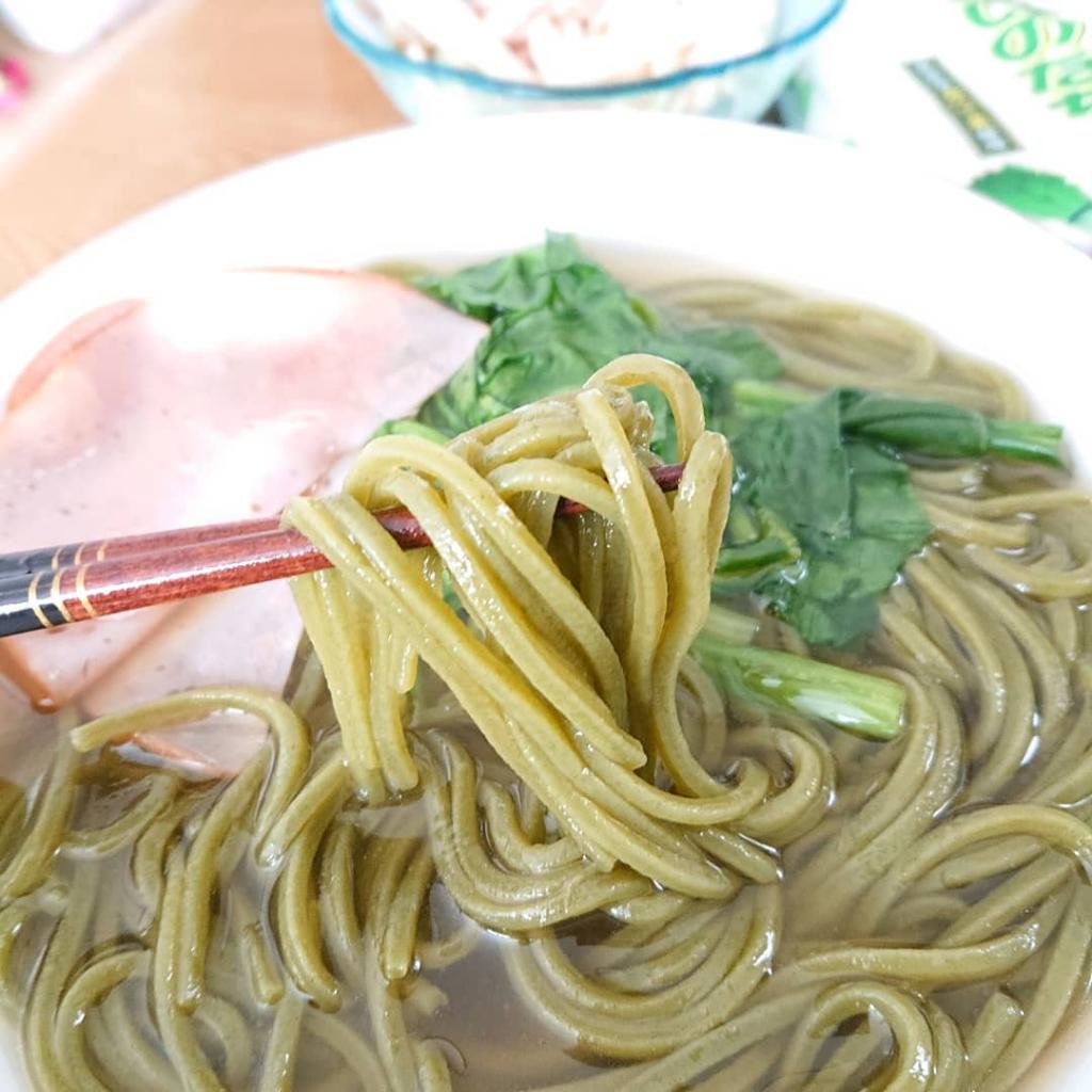 讃岐うどんの中に香川県食べて菜の粉末パウダーが入っているので自然な色素です。