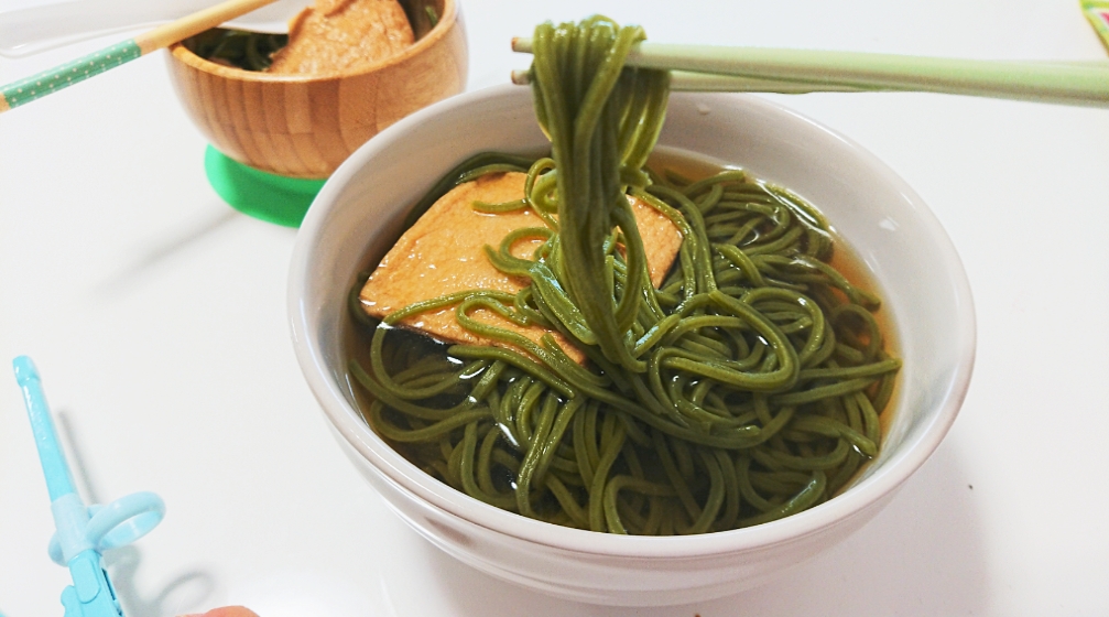 緑色の麺ですが、特に苦みとか、青臭さ、みたいなものはなく、いたって普通の麺で美味しいです☆
