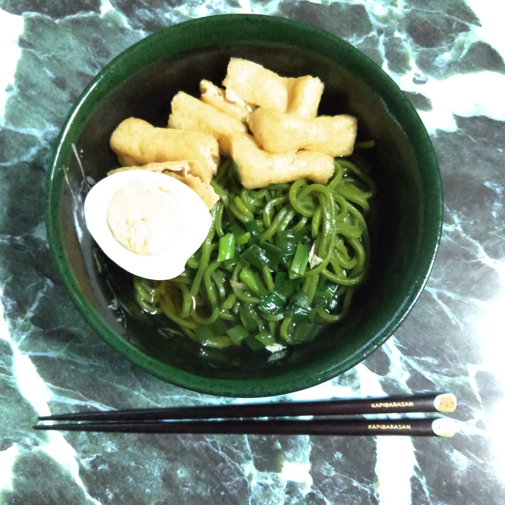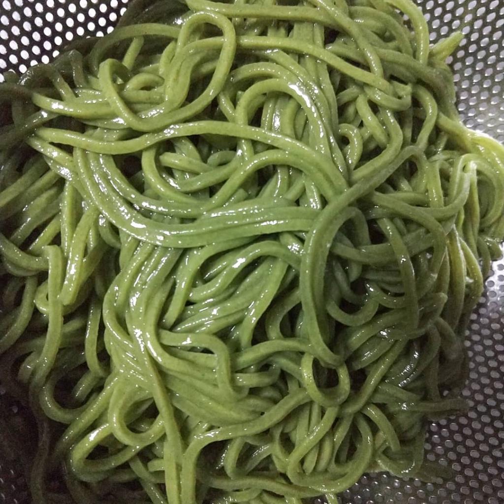 食物繊維が豊富で抗酸化作用のある食べて菜を練り込んであるので色は綺麗な緑色。茹でるとほんのり香ばしいような匂いがします。