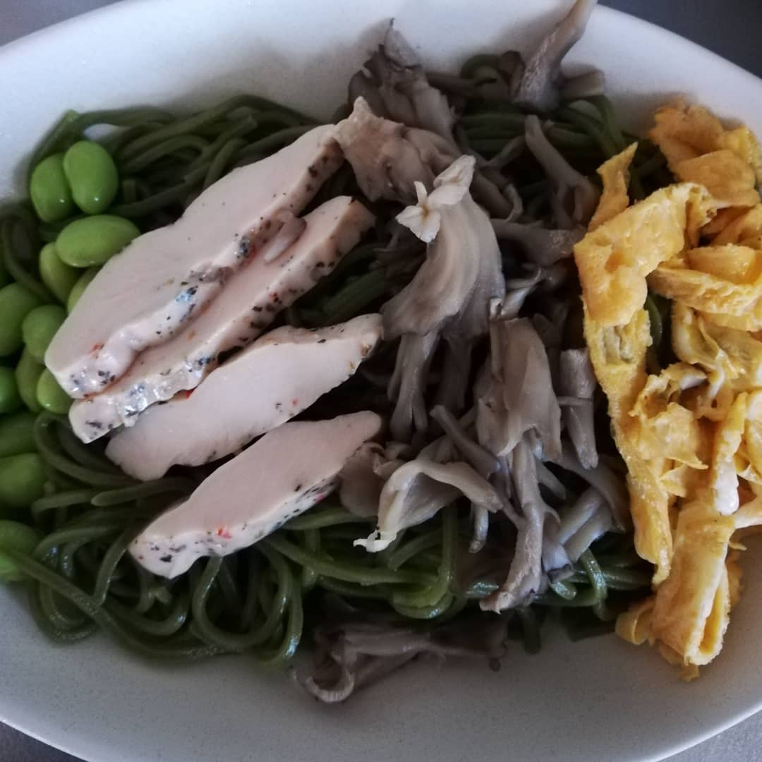 トッピングは卵に枝豆、サラダチキン、まいたけです。