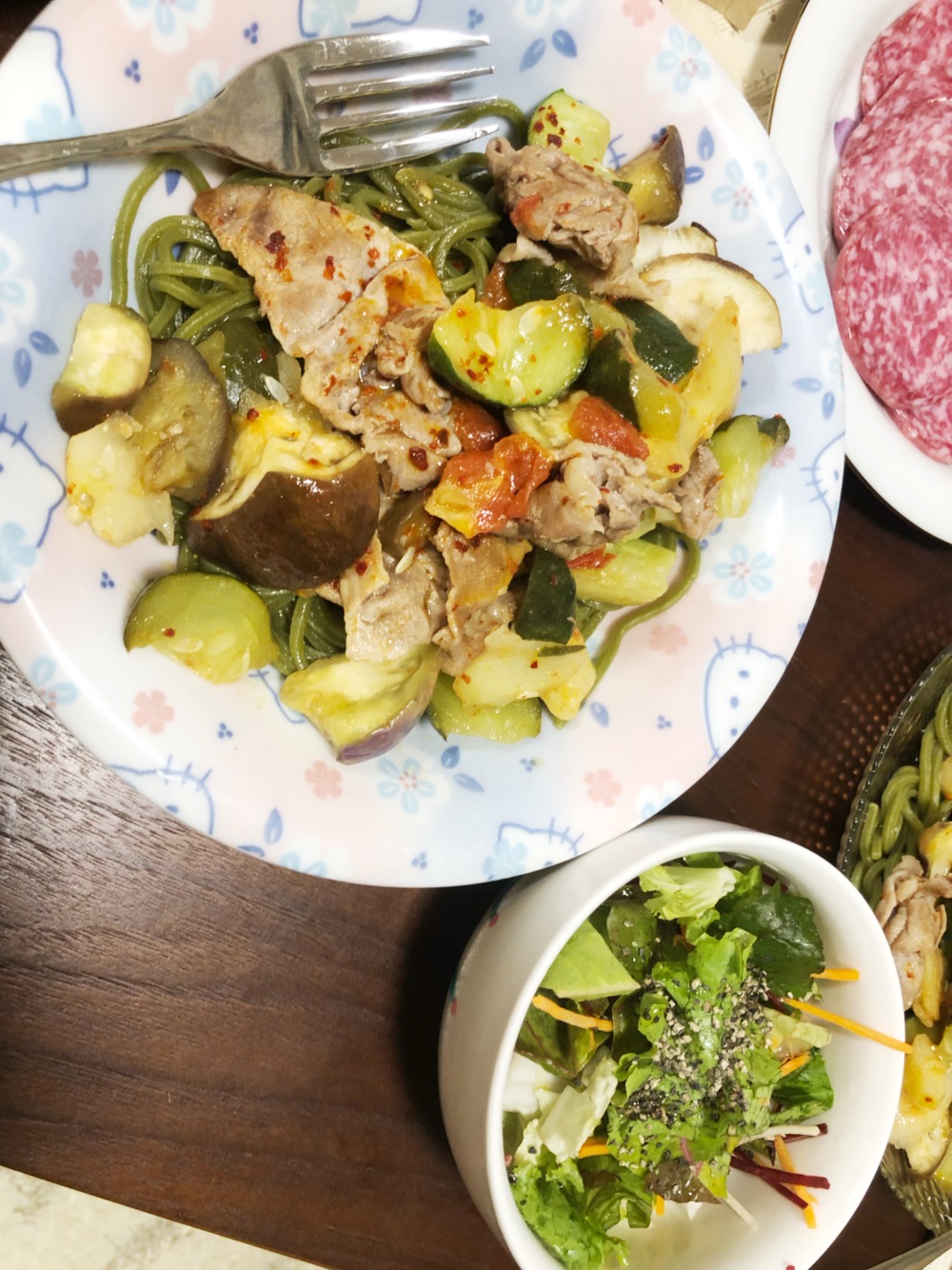 まずは、ナス、きゅうり、じゃがいも、豚肉、唐辛子で豪快に炒めたよーん!