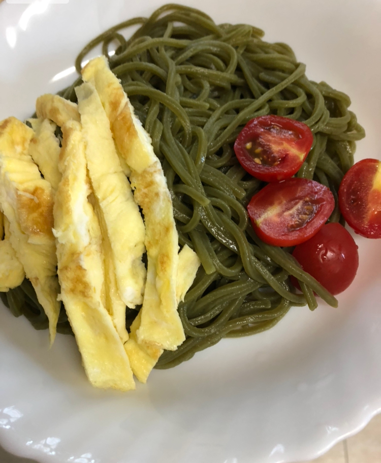 さっそく調理して食べてみました!緑のはっきりした色の麺なので、今回卵とミニトマトと一緒にお皿にのせたら彩りが綺麗でした!香りはあまりわからなかったんですが、とても美味しかったです!