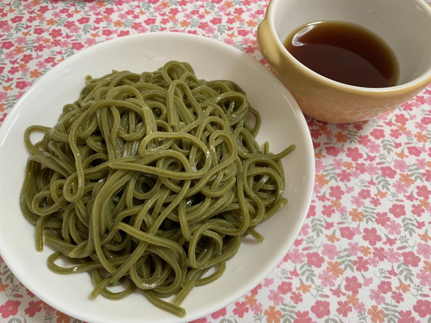 まず、袋を開けてびっくり!緑色の麺が綺麗に収まっていて、茹でる前の状態から麺の太さが普通のそばよりも2倍ほどあると感じました。