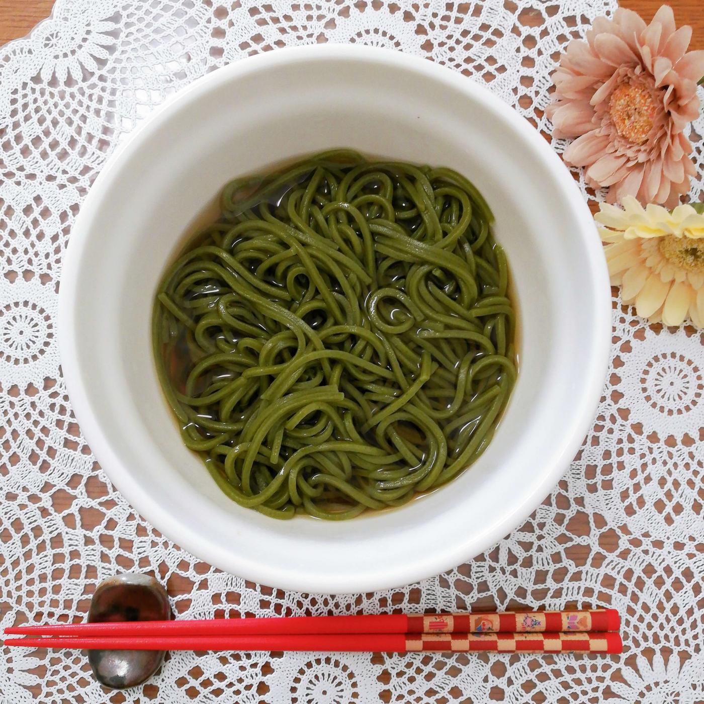 香川県のオリジナル&無農薬野菜の「食べて菜」が練り込まれた緑のうどんです。