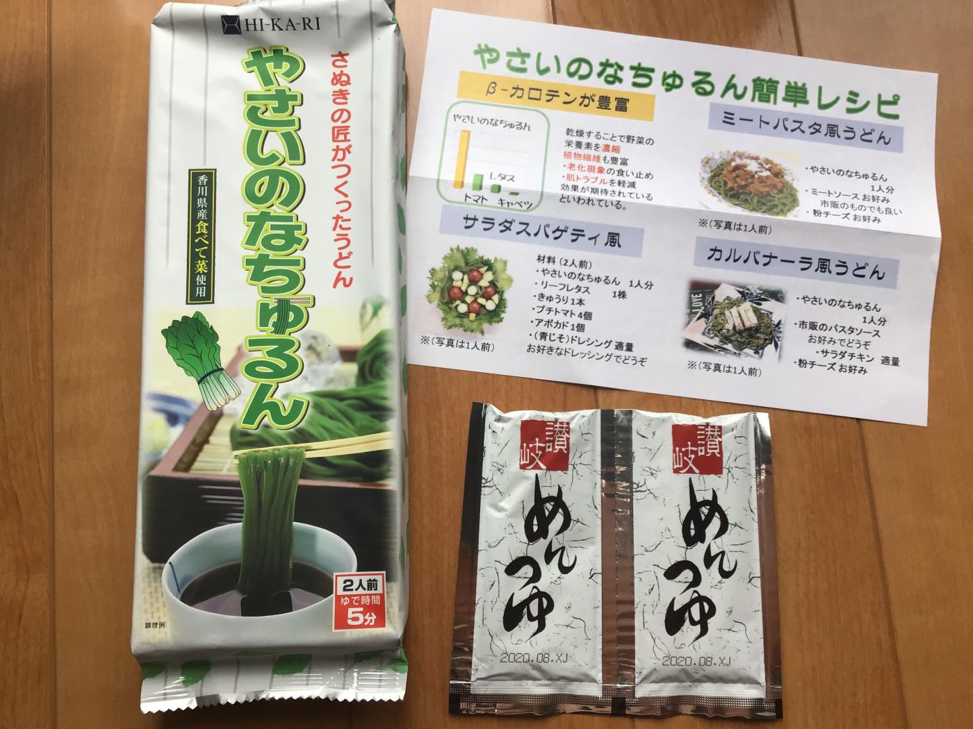 野菜のなちゅるんだけでなく、専用のツユと、美味しい茹で方やおすすめレシピの載った紙がセットになっていたので、おうどんをあまり作らない方でも手軽に調理できると思います