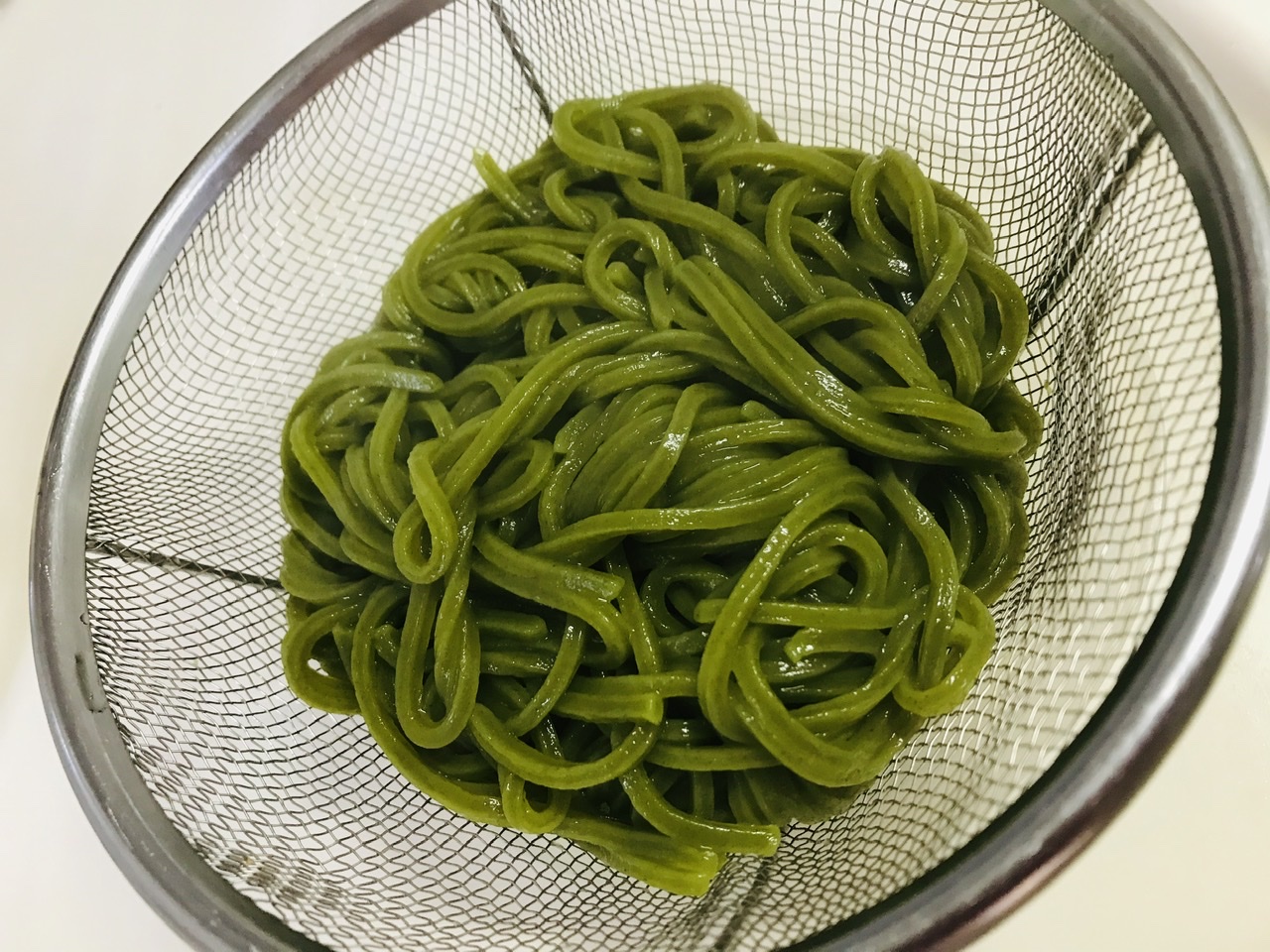 香川県産の食べて菜が練り込まれた、食物繊維とβカロテンが配合されたさぬきうどん。乾麺のうどんは初めてでしたが、パッケージから出すとU字型に固まっていて、とても湯がきやすい形をしていました。