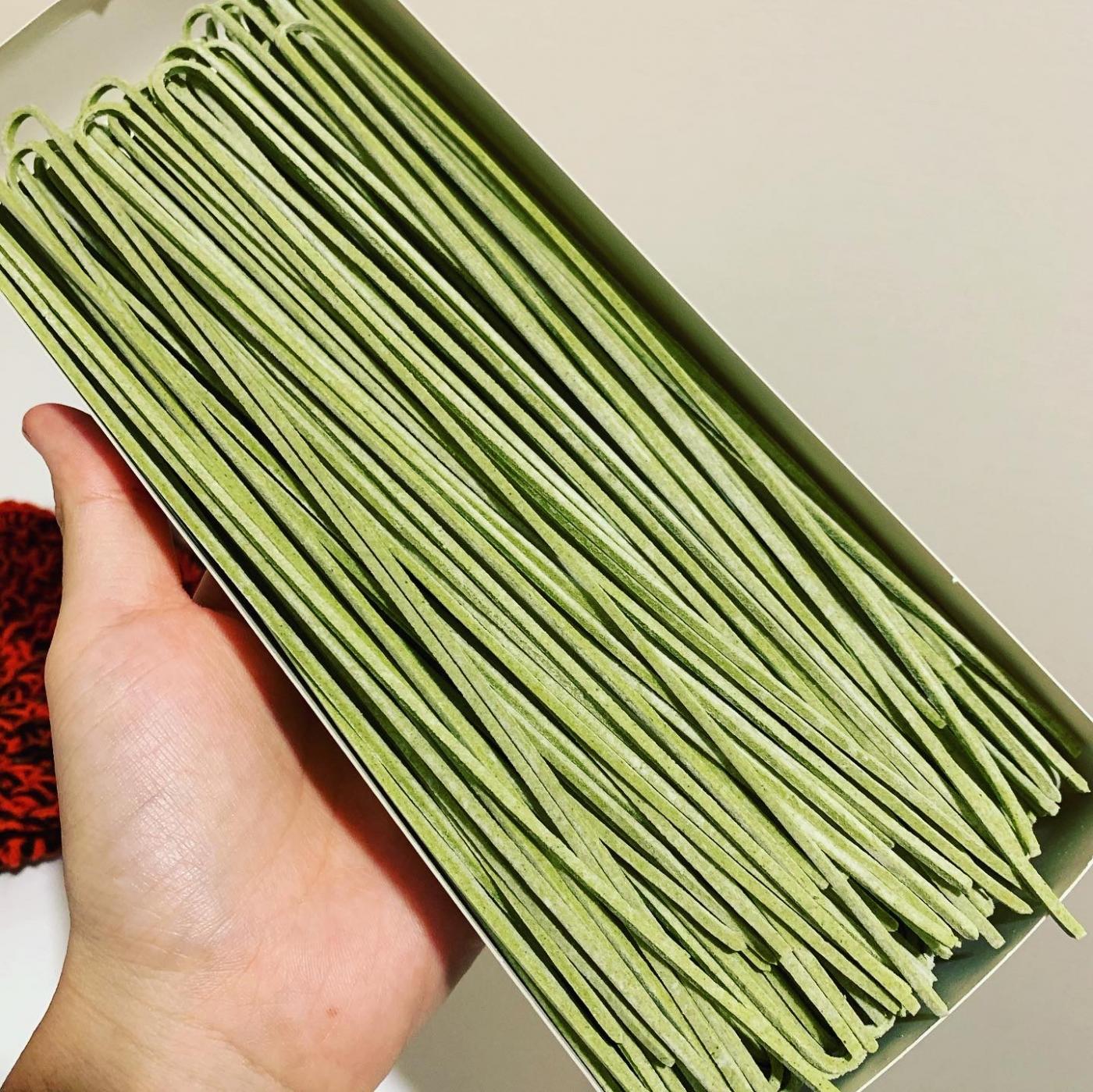《やさいのなちゅるん》とは、香川県産の食べて菜が練り込まれた緑のうどんです。