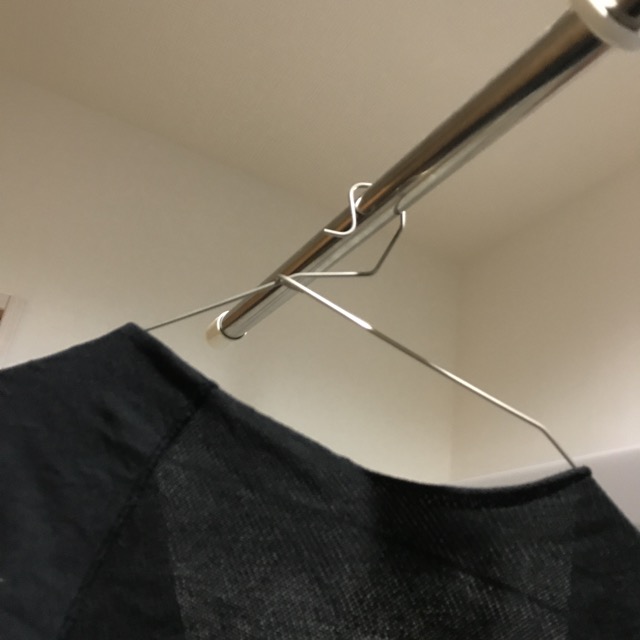 まず写真のように立てた状態にしておいて、丸首の部分をハンガーの下の部分から通して、肩までかけた状態にします。