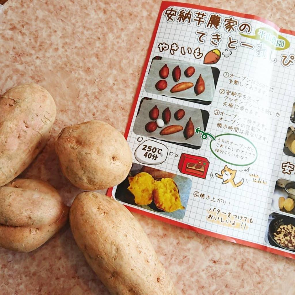 おいしい食べ方のレシピも一緒に入っていて、わくわくします。今回はせっかくなので素材の味を生かせるように焼き芋にしてみました!250℃の余熱したオーブンで、40分~45分焼いてみました☺️焼いているときから甘いかおりが部屋いっぱいにひろがり、期待が膨らみます????