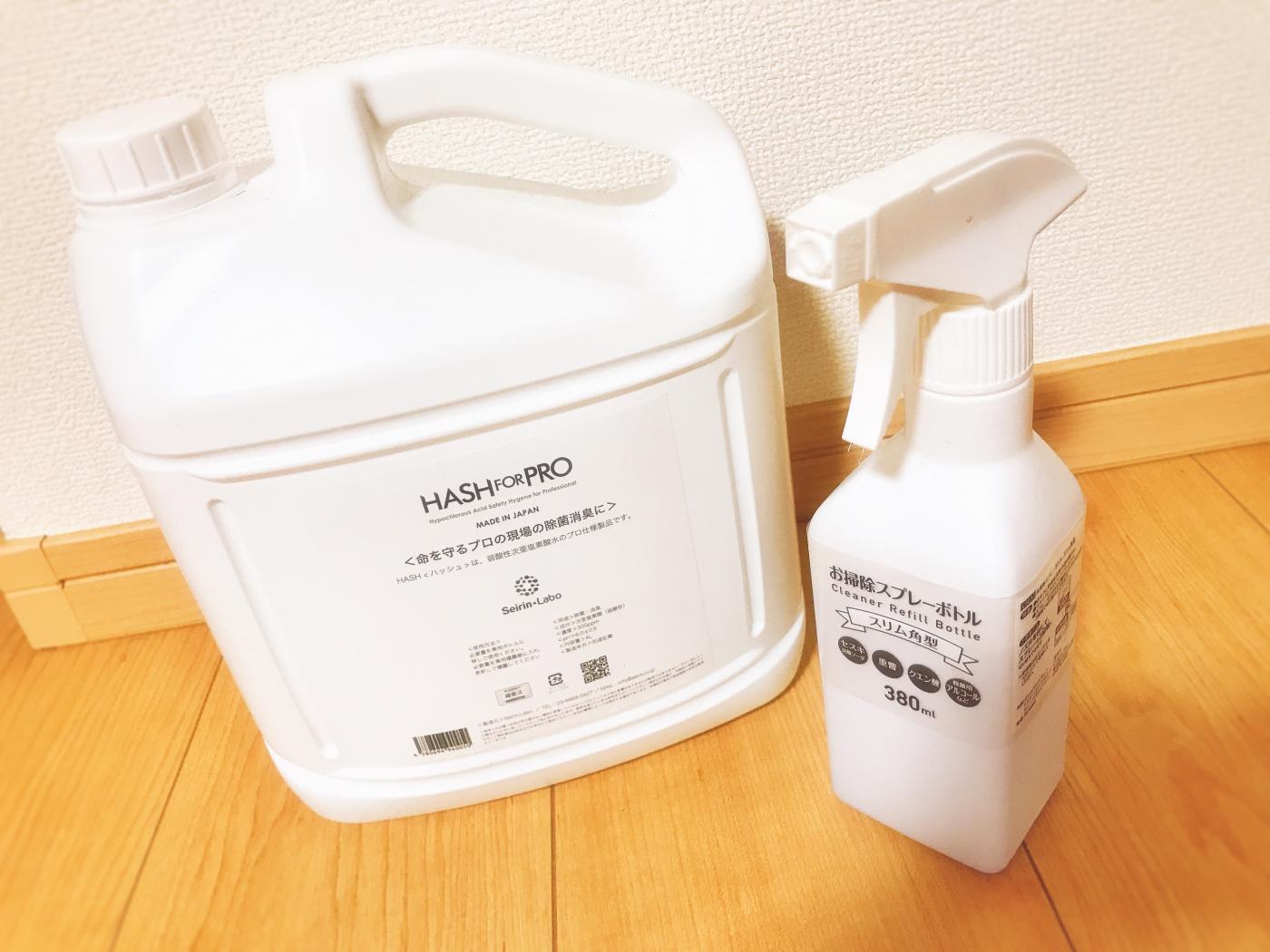 我が家は100均で購入したボトルに詰め替えてキッチン周りやリビングで使用させて頂いています。