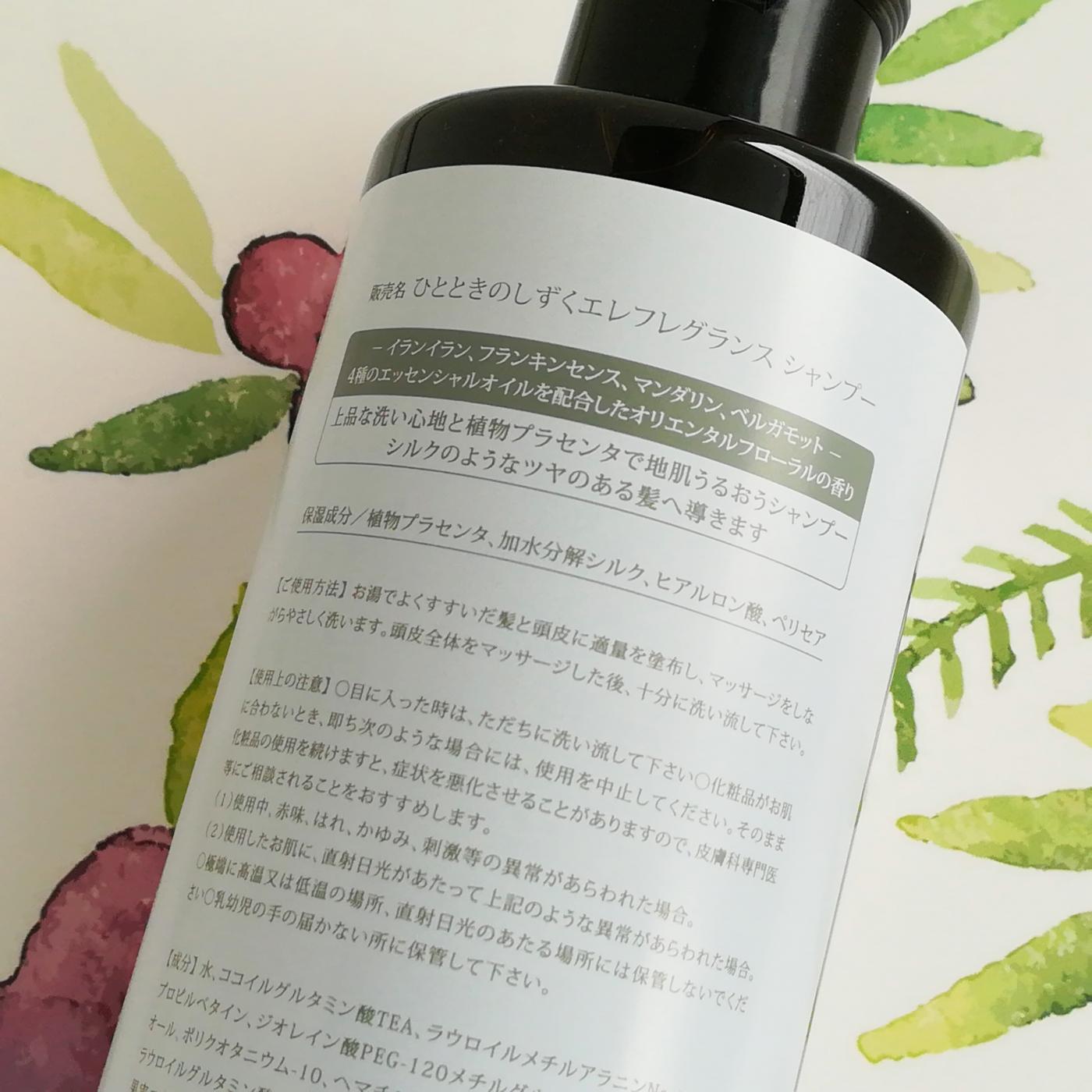 今使用しているシャンプーはこちら ⇒ eleFragrance(エレフレグランス)シャンプー。フレグランスと名がつくだけあって、イランイラン・フランキンセンス・マンダリン・ベルガモットのエッセンシャルオイルと生薬を配合しているのが特徴なんです。様々な天然のアロマが複雑に混ざり合って、深みのあるオリエンタルフローラルの香りにうっとり。また頭皮ケアを行うヘッドスパ専門店が開発したシャンプーなので、髪のアンチエイジングとスカルプケアを頑張りたいわたしにとってはぴったり。
