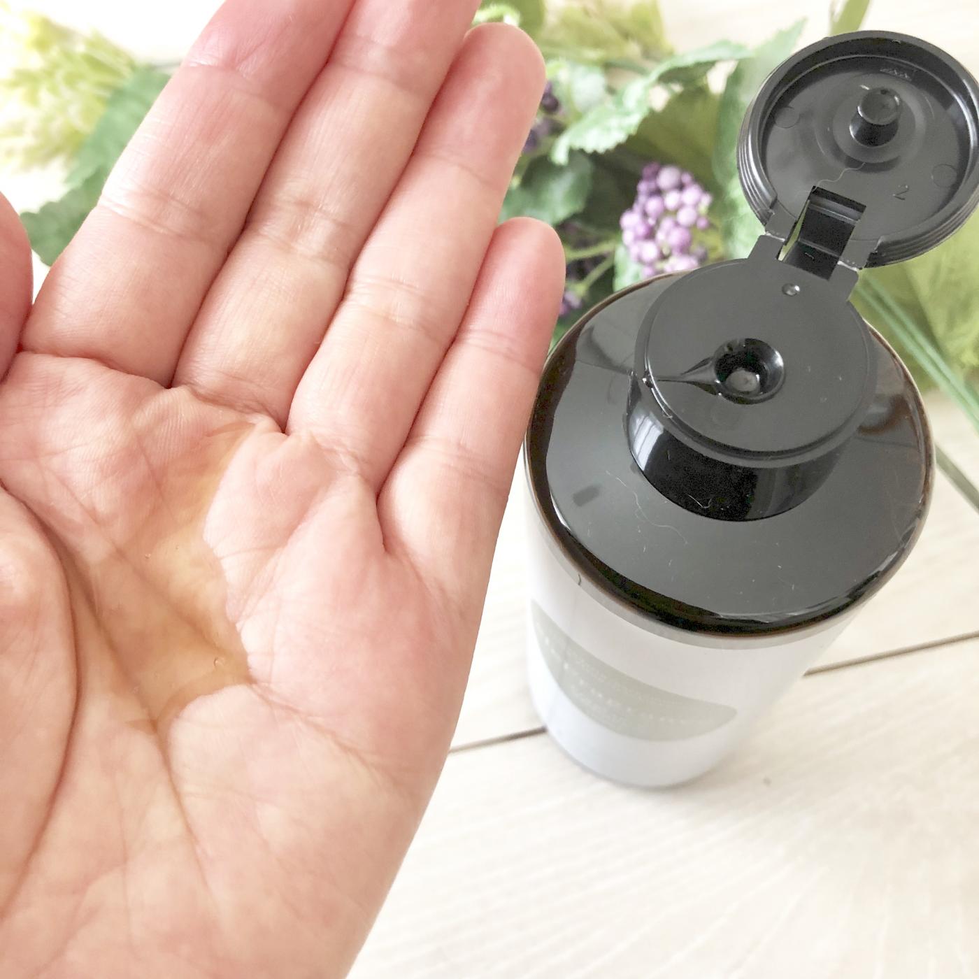 シンプルで、ナチュラルなデザインの容器な入っています。シャンプーを手にとってみると、少しブラウンがかっていて、透明で少しだけトロミがあります。香りがとても良くて、上質な天然アロマの香りがします。これは、イランイラン、フランキンセンス、マンダリン、ベルガモットの4種類のエッセンスシャルオイルが配合されたオリエンタルフローラルの香りです。爽やかな香りで私は大好きです。