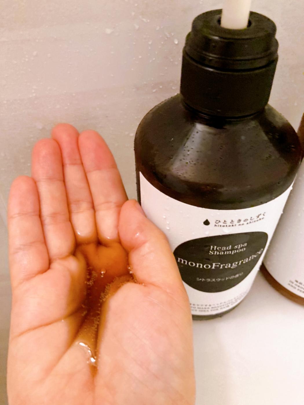 シャンプーは茶色っぽい濃いめの色のシャンプーで、トロッとしています。