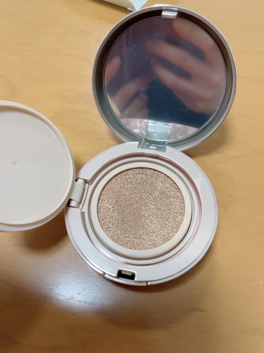 附属のパフの半分以下くらいに、ぎゅっとクッションファンデーションを押し付けます。今回使用したのはナチュラルベージュ。パフにつけた時は、ちょっと暗いかなと思いましたが、実際に肌につけるとちょうどいい色合いでした。(色白さん向けにライトベージュもあります)