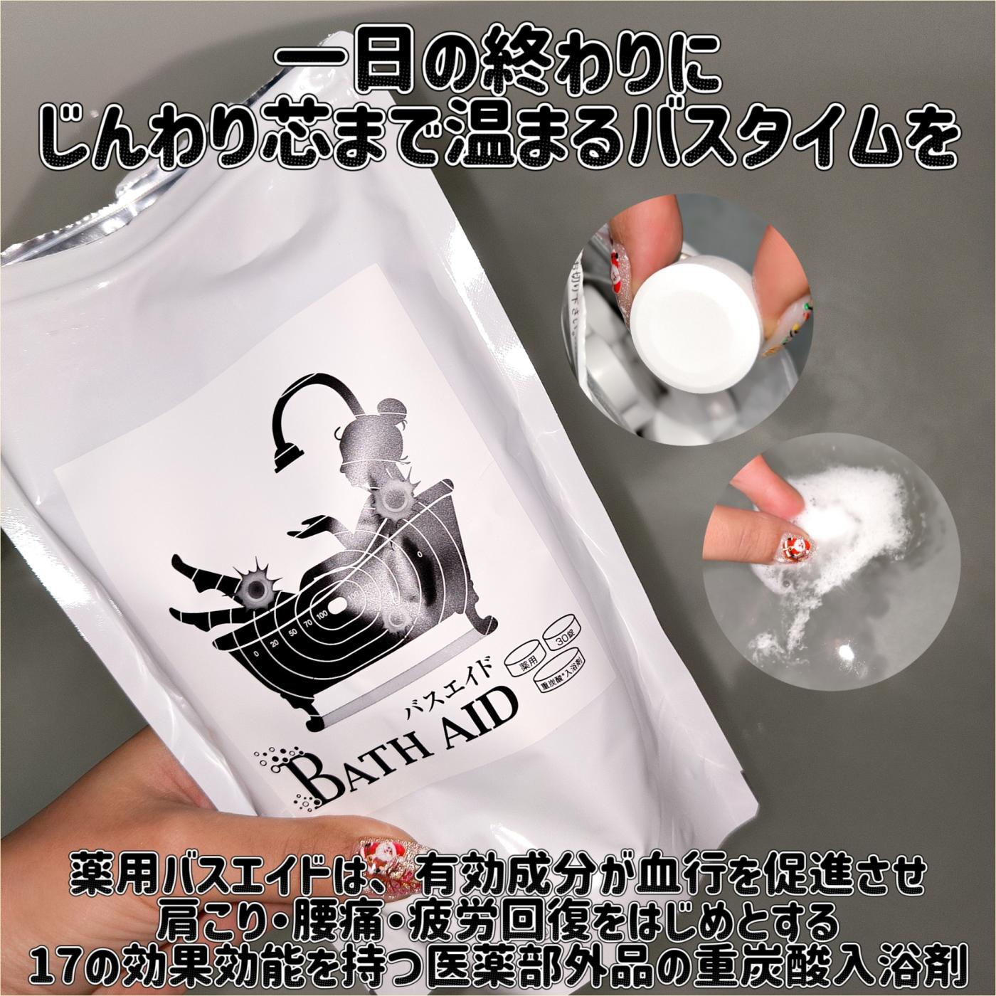 薬用バスエイドは、有効成分が血行を促進させ、肩こり・腰痛・疲労回復をはじめとする17の効果効能を持つ医薬部外品の重炭酸入浴剤。