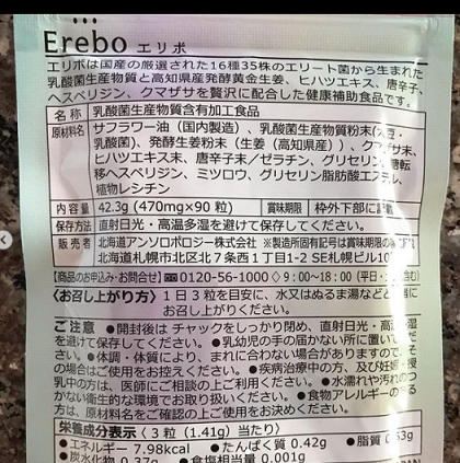 エリボには、乳酸菌生産物質や、北海道のクマザサエキスが、配合されてあります。食物繊維やヒハツエキス、唐辛子なども入っていて、身体を温めてくれる効果も期待できるんです。小さな粒に、私の体を応援してくれる成分がたっぷりです。