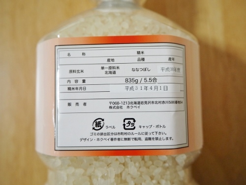 ペットボトルの中には、835g(5.5合)の量のななつぼしが入っています。