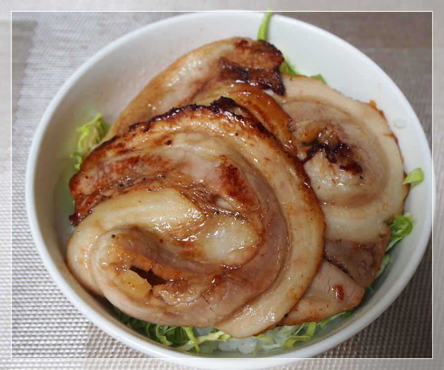 千切りキャベツの上に厚めにカットしたチャーシューを乗せれば、ガッツリ男子満足