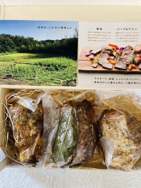 創業50余年の老舗食肉加工会社・徳永食品さんが放牧豚の豊かな味わいを活かすため、これまでにない味付けを考案、焼豚専用ロースターで回転させながらじっくり焼き上げて、余計な脂身を落とし、風味を閉じ込めたローストポークです、放牧豚の部位でも特に赤身の割合が多いモモ肉をしっとりと焼き上げ、3種類のフレーバー(ワイン&ハーブ、梅酒、チーズ)を取りそろえた叉焼の詰め合わせた商品、真空パックで届くので衛生面もきちんとしています