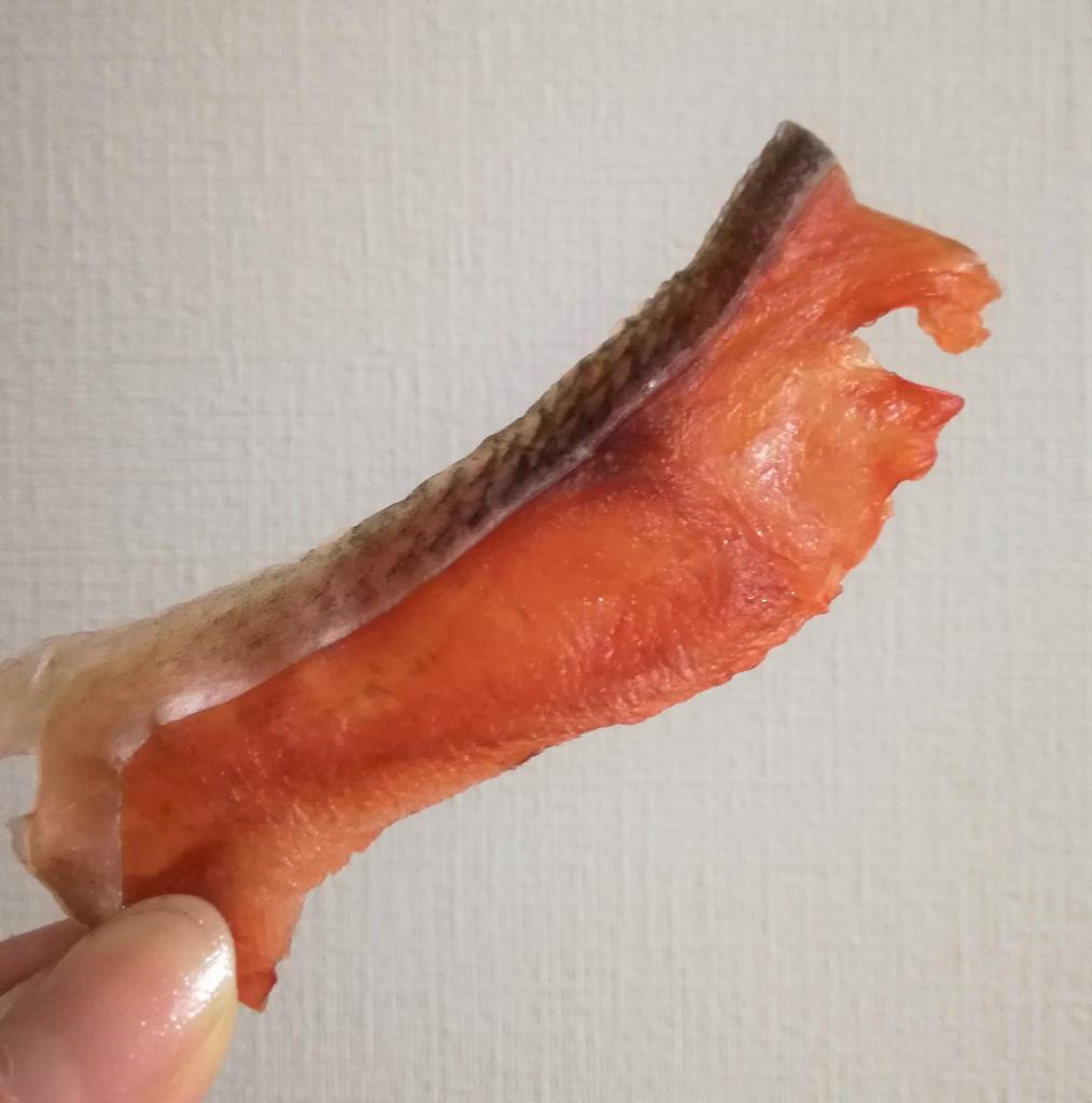 そもそも鮭とばって何?という方おられると思いますが、薄くスライスした鮭を海水で洗って潮風にあてて干したものを言います。漁村の光景が妄想で広がる感じ。