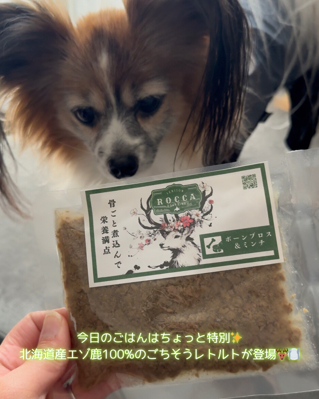 食物アレルギーのある我が家のパピヨン・美輝(みら)に、「ROCCA FOR DOG レトルト エゾ鹿ボーンブロス&ミンチ」を与えてみました🐶✨