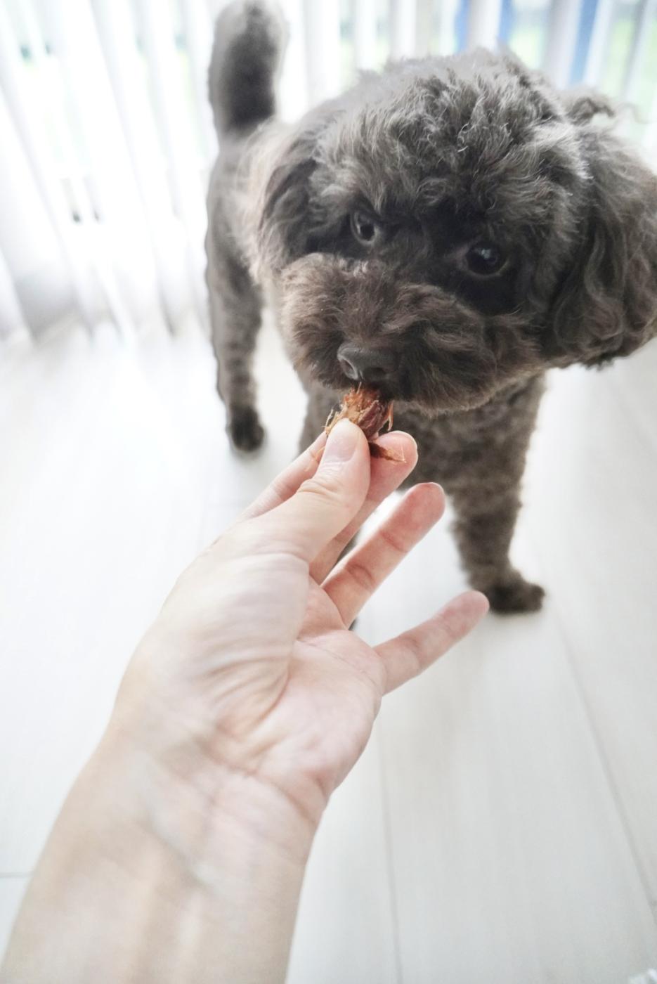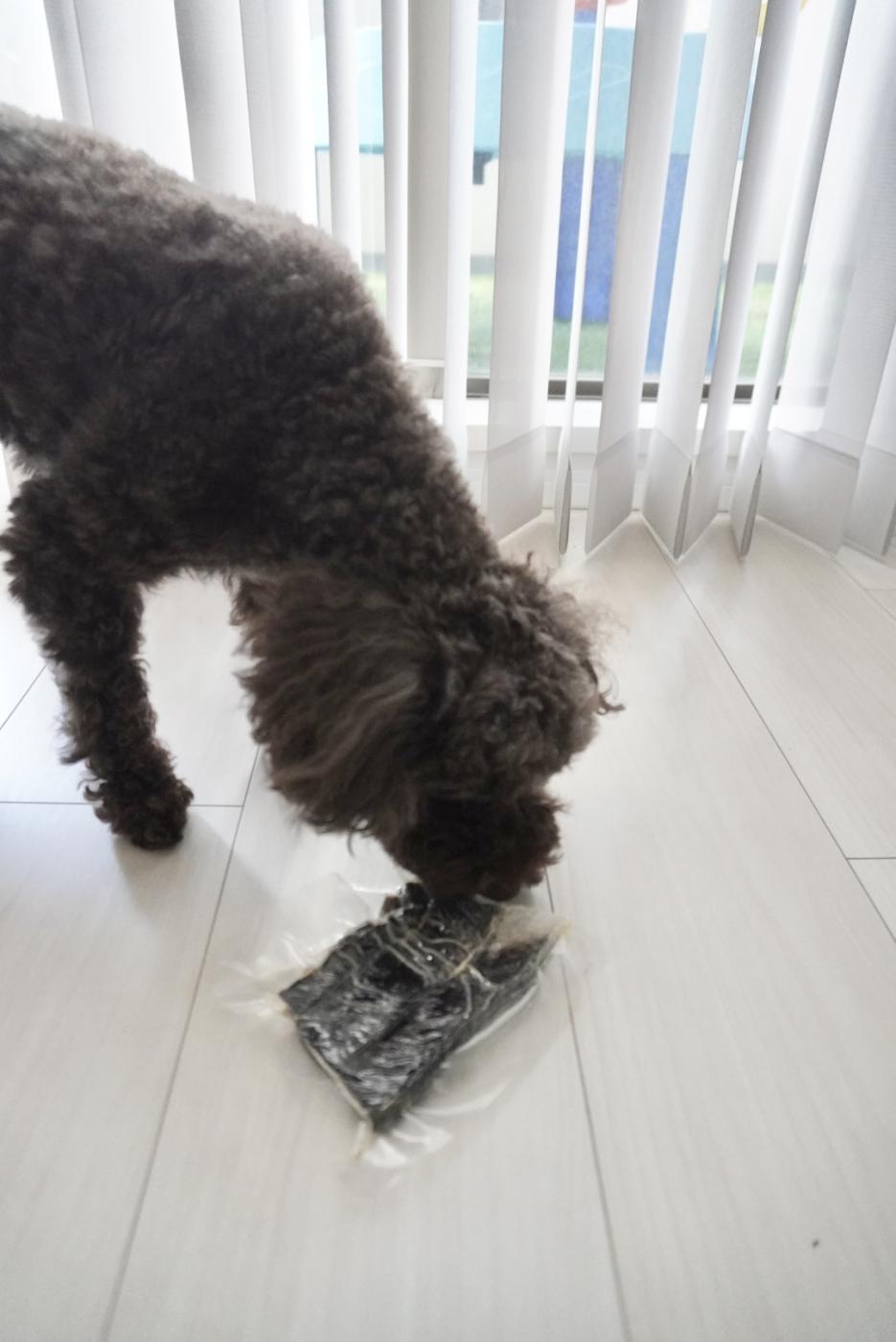 早速封を開けると、新鮮なエゾ鹿肉の香りにつられて愛犬が早くちょうだいとオネダリ。美味しいおやつしか目がない愛犬も食べる前から大興奮。レアの状態なので手でもちぎりやすく、口の大きさや体格に合わせて簡単に裂くことが出来ます。あげてみると、とっても美味しかったようで食べっぷりが凄い!