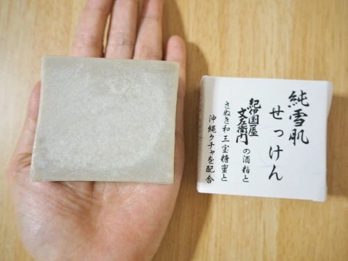 開封するとグレーっぽい色の石鹸がフィルムに包装されています。