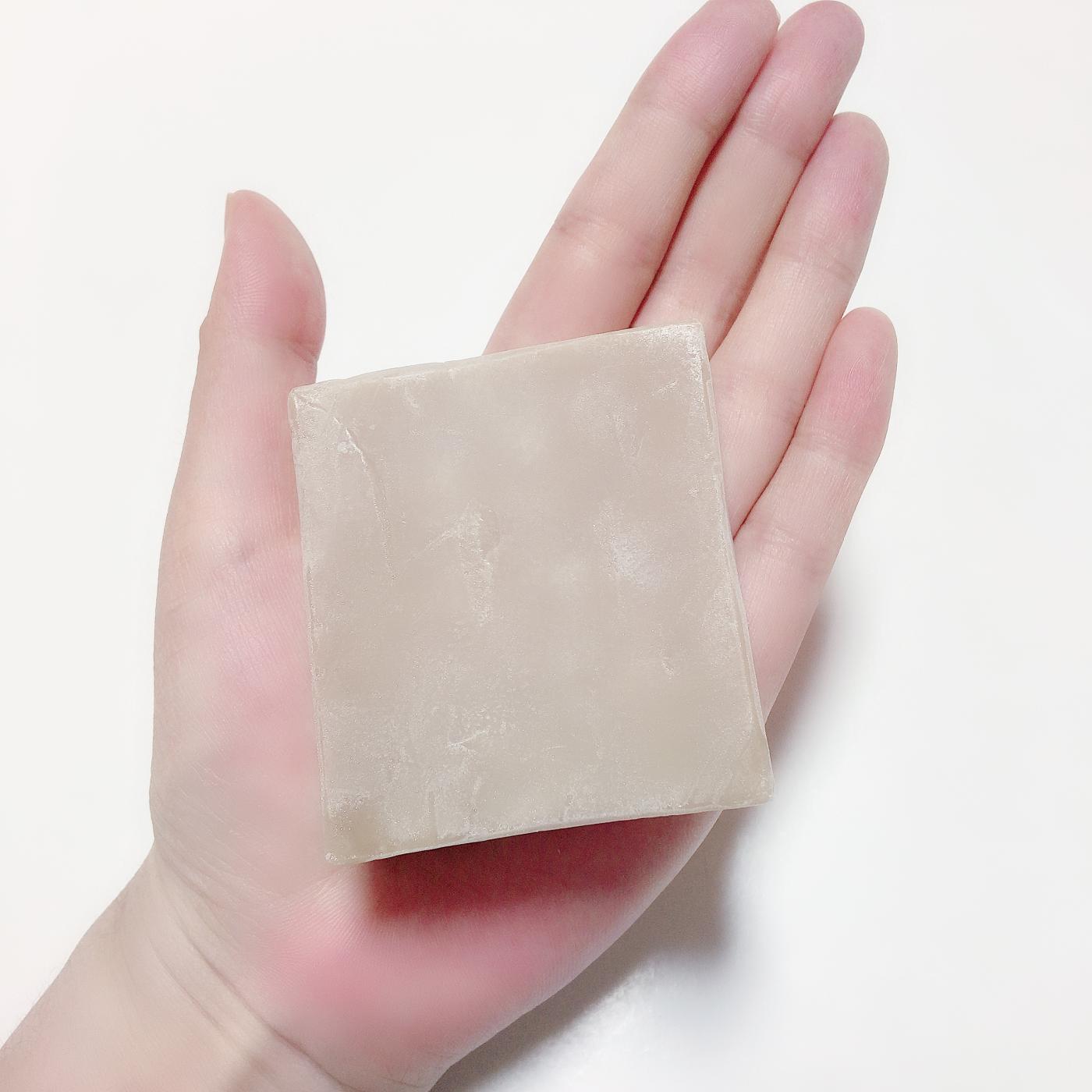 手のひらサイズのベージュ(グレージュ)の石けん。