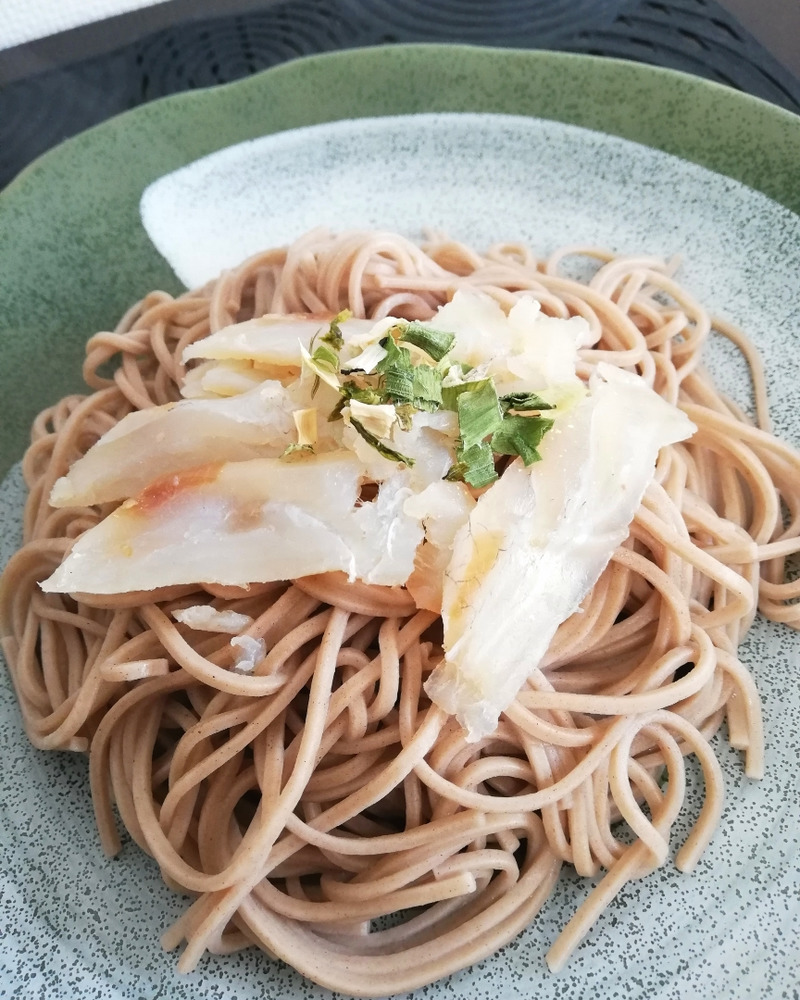 鯛の柔らかい食感と蕎麦のコシのある食感。