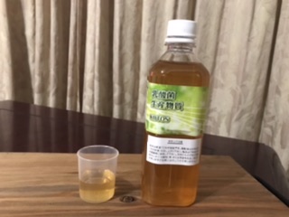 KS乳酸菌生産物質は超高品質活性化水と沖縄産超高品質黒糖を原料にオリジナルの乳酸源を添加し発酵熟成させたものだそうで独特の酸味があると聞いていたのですが味は黒糖のおかげでまろやかで全然いけます。
