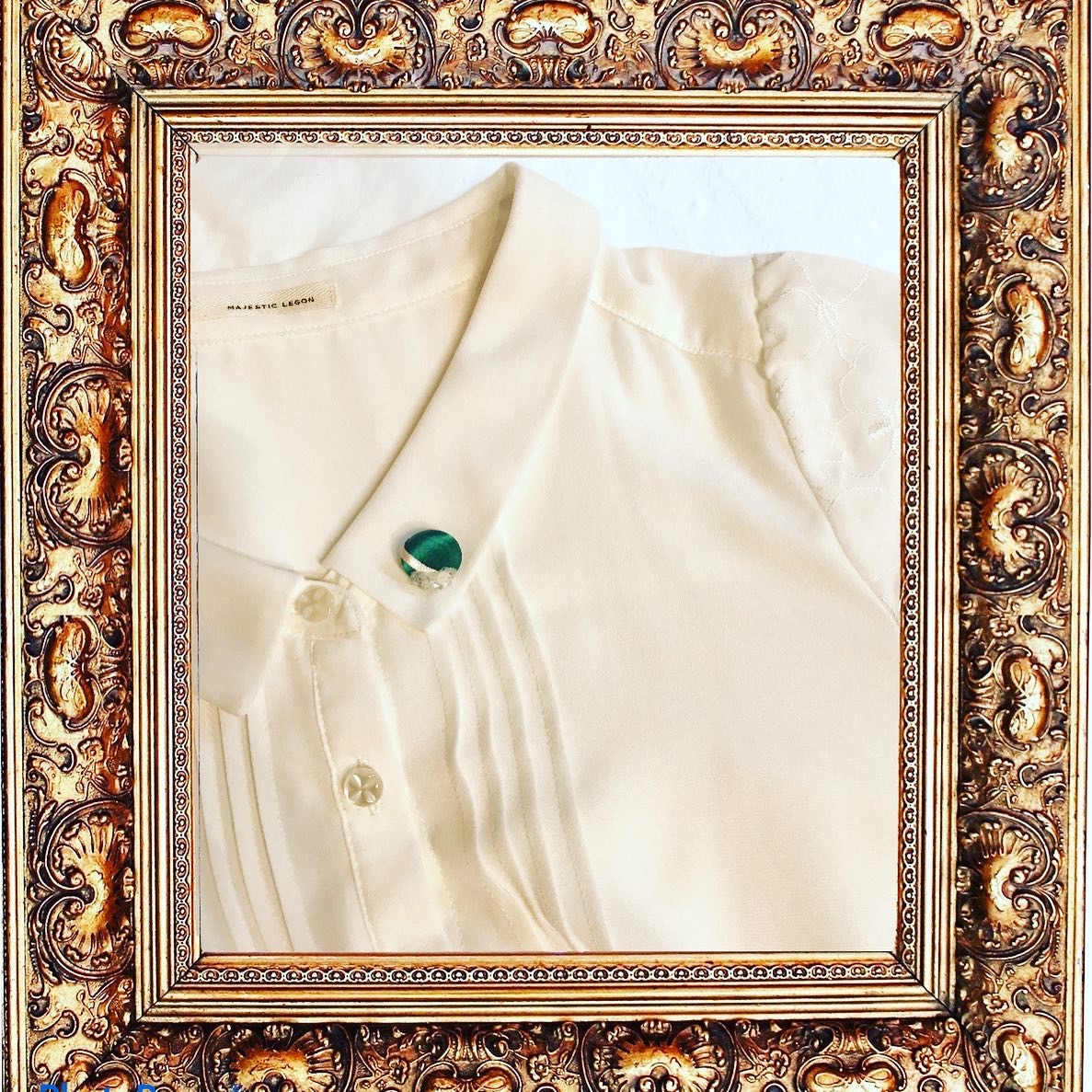 アクセサリーを通じてよりフェアな社会の仕組み造りを志すブランド、ifmeのピンブローチをブラウスの襟元に付けてみました。