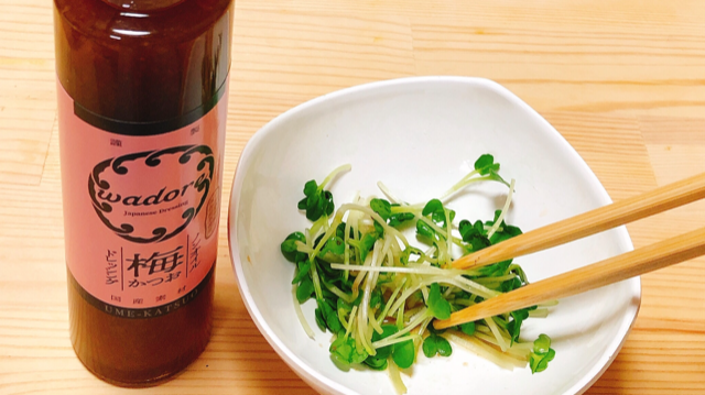 だいこん、かまぼこ、カイワレにこのドレッシングをあえて、最後に鰹節をかけるメニューを旦那さんが考えてくれました。