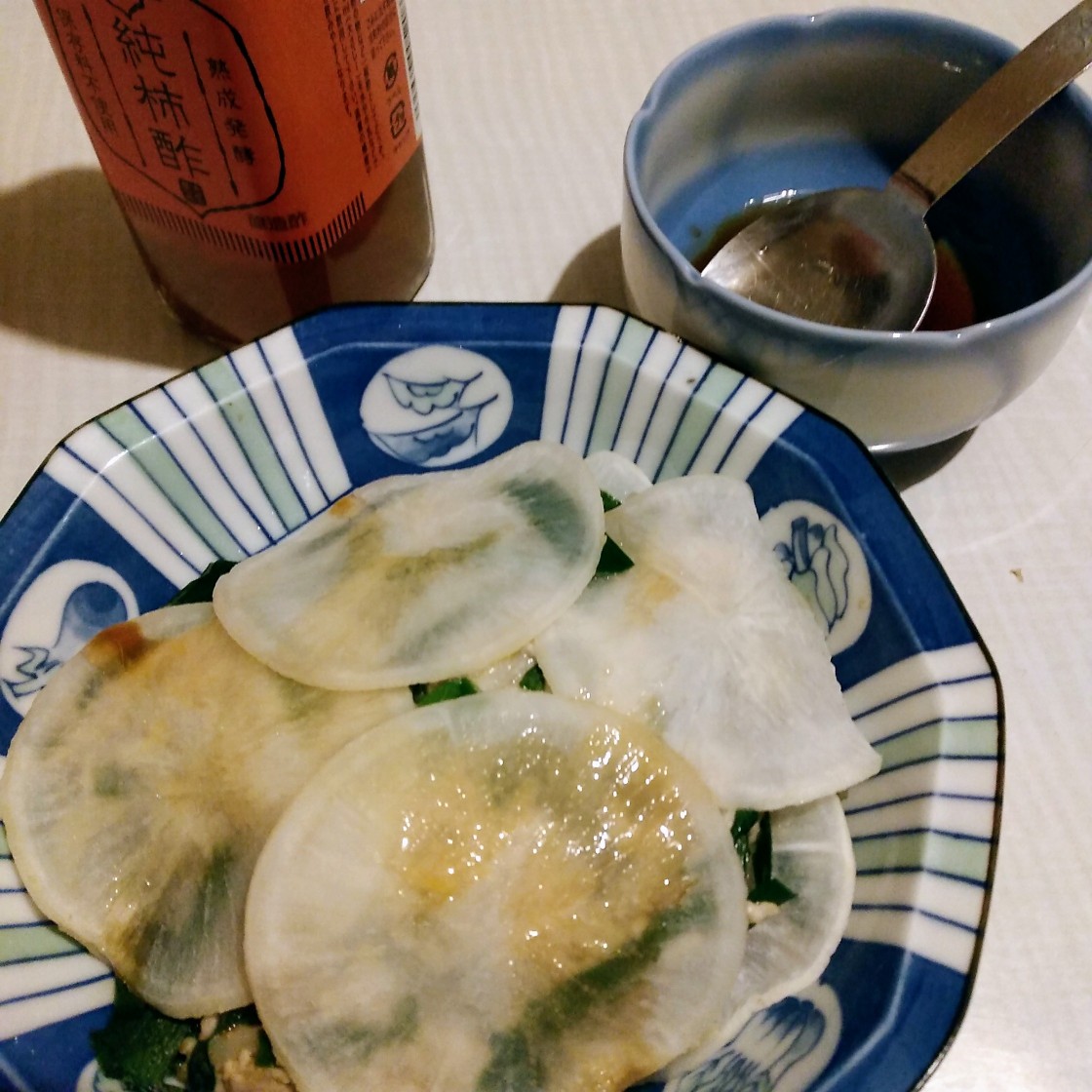 今回、『大根の柿酢マリネ』と、大根を餃子の皮代わりに使用した、『大根の重ね蒸しのポン酢ダレ』に柿酢を使用してみました。
