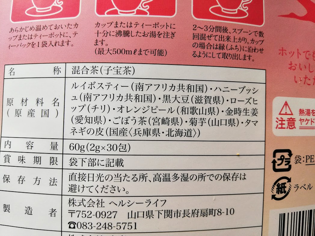 飲んでみるとルイボスティーが主体の味。麦茶とは違う香ばしい香りもします。少しスッキリする飲み心地なのは、ローズヒップやオレンジピールが入っているからかなぁ。