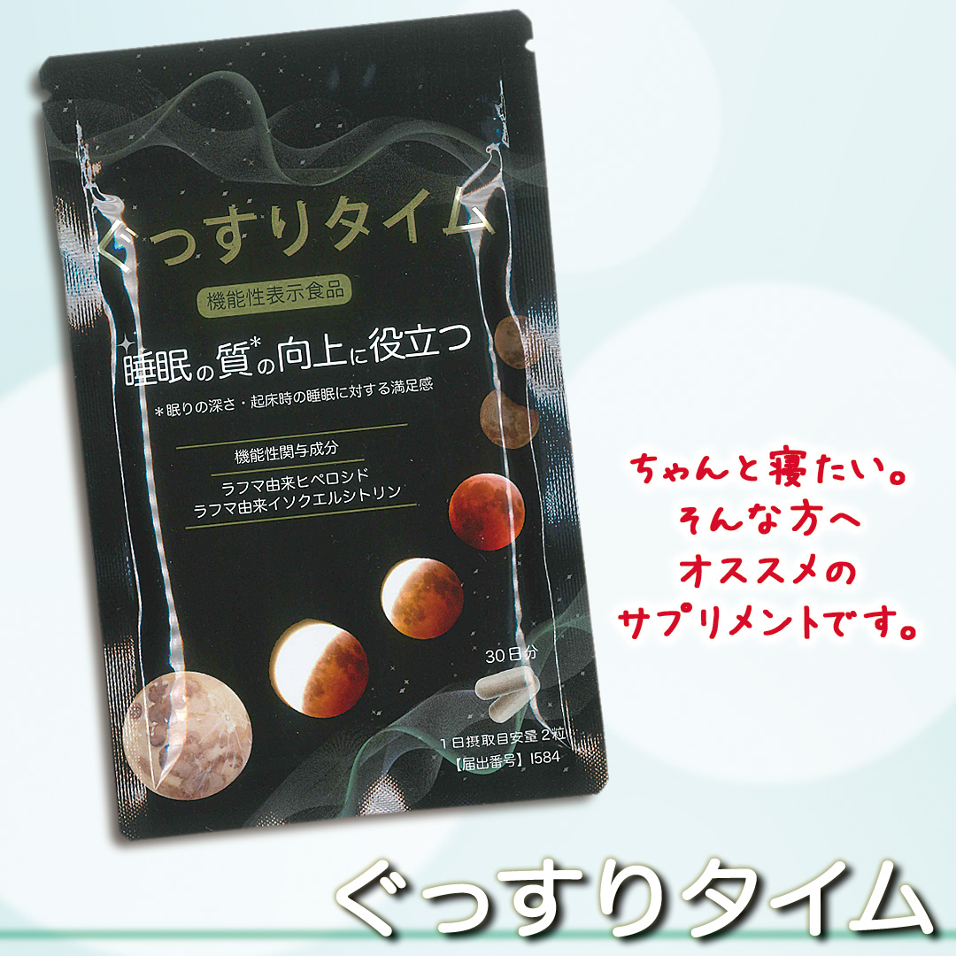 『ぐっすりタイム』はサプリメントです。効果を保証するものではありません。体調や普段の生活とのバランスよい使用を推奨します。