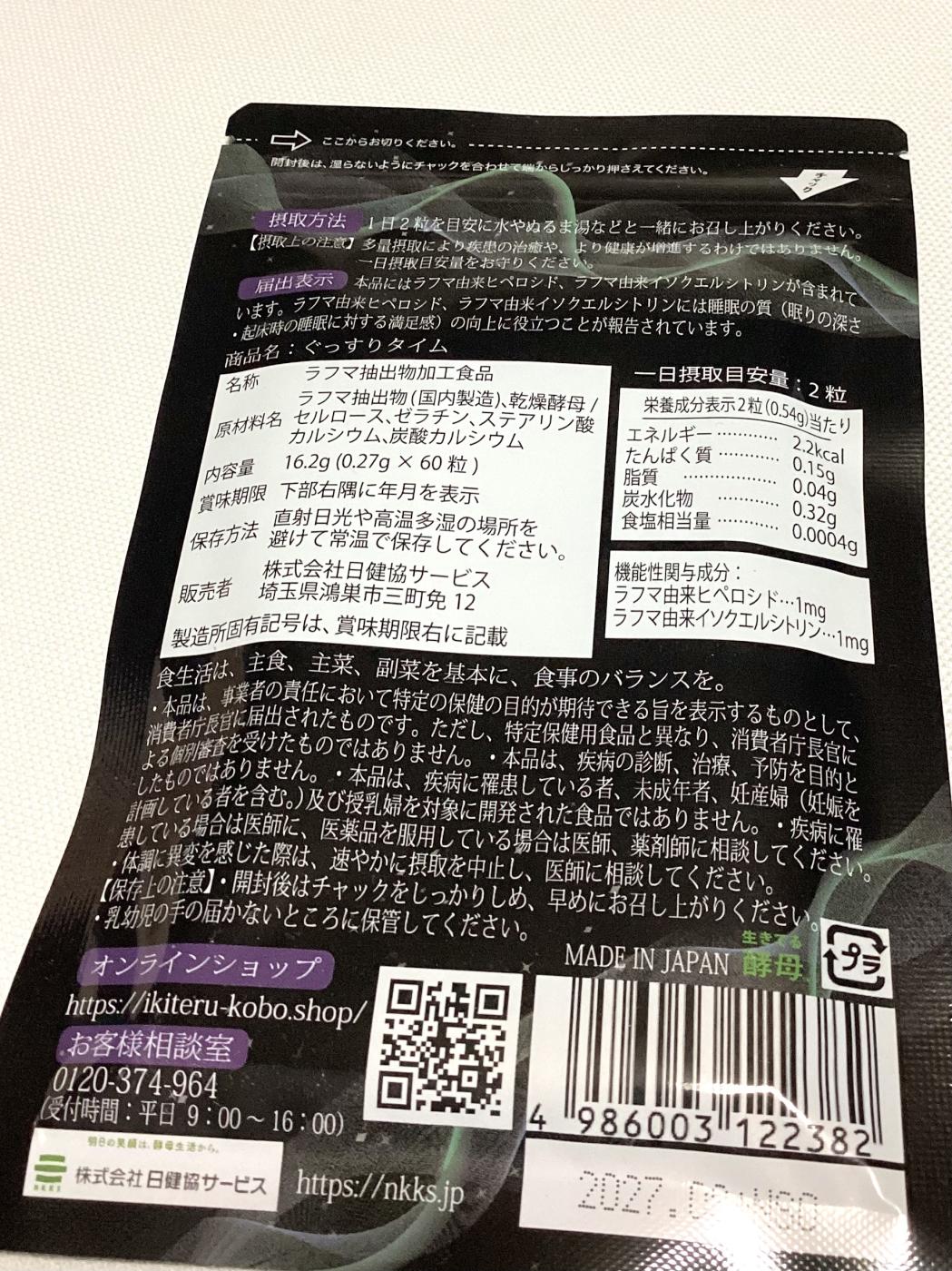 ぐっすりタイムに含まれている成分は、天然のハーブから抽出されているラフマ由来成分*ということなので、試しやすい印象。1袋60粒いりで、1日の目安量は2粒と多くないですし、飲み込みにくさも特にないかな。