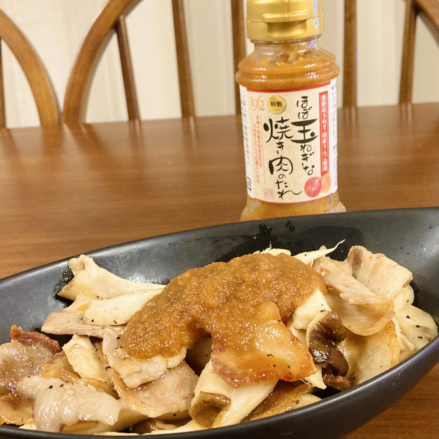 豚カルビ肉とエリンギを焼いて、「ほぼ玉ねぎな焼き肉のタレ」をかけて食べました。