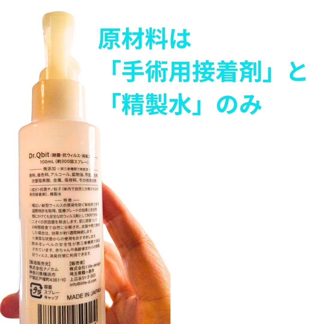 Dr.Qbitは大学医学部で開発された、医療グレードの抗ウィルススプレーで、原材料は、酵素で自然に分解される「手術用接着剤」と「精製水」のみで作られています。